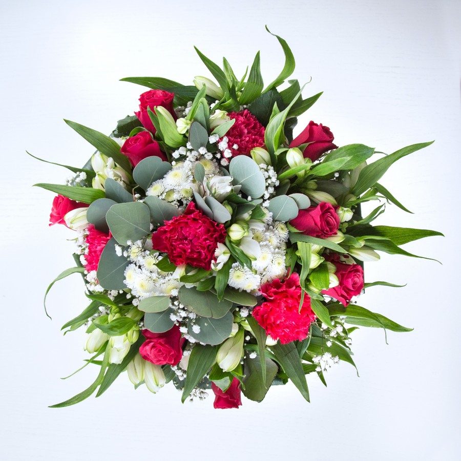 Celebrate with the refined beauty of our red and white floral arrangement. This exquisite bouquet features lush red roses and pure white chrysanthemums, complemented by delicate gypsophila and lively carnations. Enhanced with white alstroemeria and aspidistra leaves, each flower is hand-picked to ensure top-notch freshness.